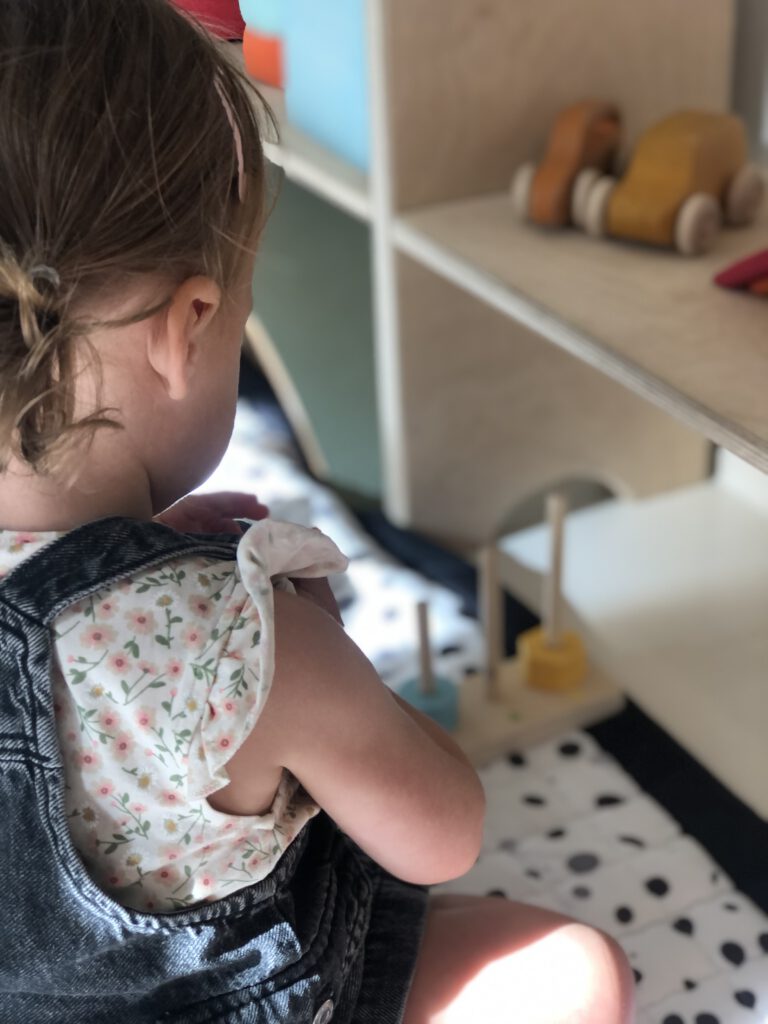 Binnen in de speelruimte zijn verschillende Montessori materialen aanwezig. Zo zijn er open, houten kasten waar kindjes zelf het speelgoed kunnen pakken dat zij interessant vinden. Het speelgoed in deze kasten rouleert per week, zodat het aanbod interessant blijft. Ook zijn er voor de fysieke uitdaging een klimboog, een klimdriehoek, een lage glijbaan een Wobbel en Stapelstein aanwezig. Als het slecht weer is en de kinderen hebben behoefte aan klimmen en klauteren, kunnen deze materialen klaargezet worden. Kinderen worden ook aangemoedigd om mee te helpen met de dagelijkse dingen, zoals het smeren van hun eigen boterham, fruit snijden (met een veilig Montessori kindermes), de tas mee uitpakken, poetsen na het eetmoment, etc.